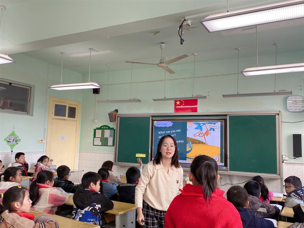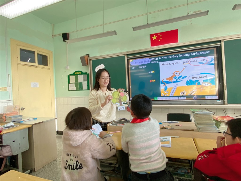 沈恩乐老师亲切温柔,在她的带领下,四年级孩子的课堂生动有趣,活力满满。课堂伊始以儿歌热身,激发孩子学习英语的兴趣,逐步进入头脑风暴环节,让学生说说有关已学过的水果英语单词,并围绕这一环节展开活动。在这一环节中,张老师帮助学生对前面学过的单词和句型进行了复习巩固,完美地向在座的老师展示了模范的教学。接下来张老师领着孩子们用讨论的形式来唤醒孩子们对句型的记忆,并设计对话、介绍、表演的环节,让学生展现自己的学习成果,体验英语学习的成就感。